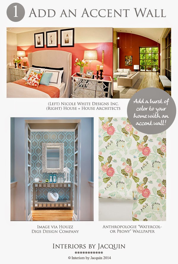 Creating an accent wall is a fun way to add color to your space. Try pulling out one of the brighter colors in your décor and use that color for your accent wall. Even if it’s an especially bright color, using it on only one wall will generally be the perfect touch. If you’re feeling a bit more adventurous, you can create a more graphic wall accent with wallpaper, as seen above. Either way, you will have made a great addition to your home.