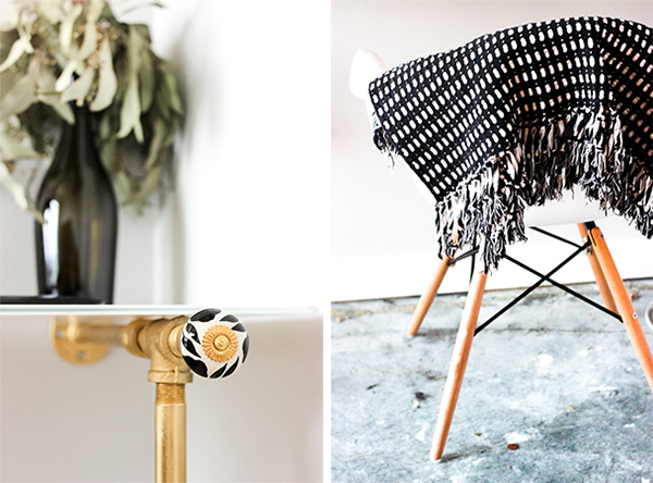 Tiffany: I made the desk in my bedroom! Living in a one bedroom condo requires a bit of creativity in terms of fitting in a desk. I also wanted to save money since desks are so expensive, so I went the do it yourself route. It’s been such a great solution because this floating desks only requires two legs and is attached to the wall. Perfect space saver! I made this floating desk from pipes, a glass top and drawer knobs. Check out the stylish doornob details in the photo of my desk below. You can find the tutorial for my DIY floating desk on my blog here.