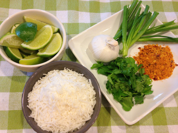 - In a small mixing bowl, combine honey, remaining lime juice, zest of 1 lime, shredded coconut, cilantro, remaining 1 tablespoon green onions and ¼ teaspoon curry powder.