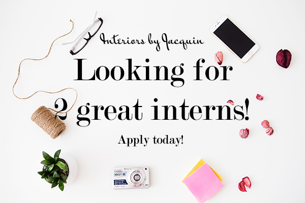 Things have been so busy around here that it seems it’s time to find a motivated intern to help out! I’m looking for 2 great interns to help with social media, in addition to writing and editing guest posts for my interior design and lifestyle blog. While this is an unpaid position for now, there is much to be gained! I am an entrepreneur with multiple businesses outside of my blog. I also have a law degree and I work providing business development services for new businesses and entrepreneurs. I would love to help mentor a writer/blogger/new entrepreneur through this opportunity. This is a work from home, remote position. College students are perfect for this opportunity, although being a college student is not required. Applicants should have strong writing skills. To apply, email your resume and cover letter to: InteriorsbyJacquin@gmail.com