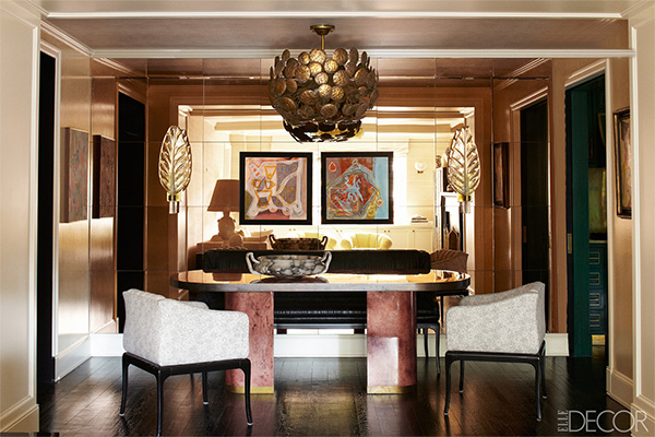 Last but not least is the insanely luxurious home of Cameron Diaz, decorated by Kelly Wearstler. Each space in this home is truly original, but when Kelly Wearstler is your interior designer, you know that you’re in for beautiful and unique decor. Cameron’s feminine living room (shown below) is simply gorgeous! The blush colored grass cloth wallpaper makes a huge impact in this neutral space.