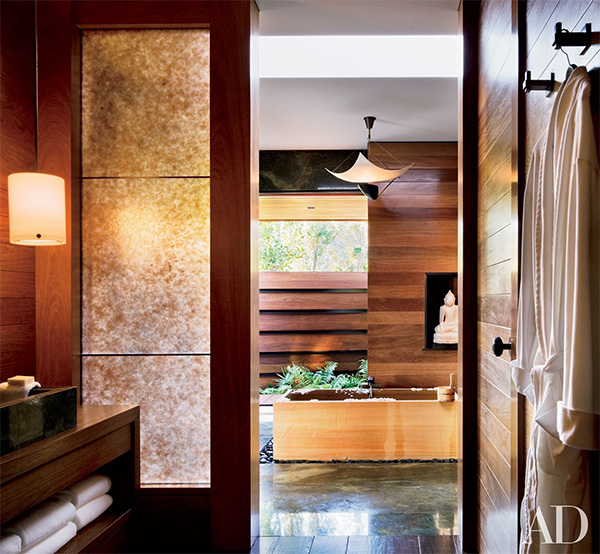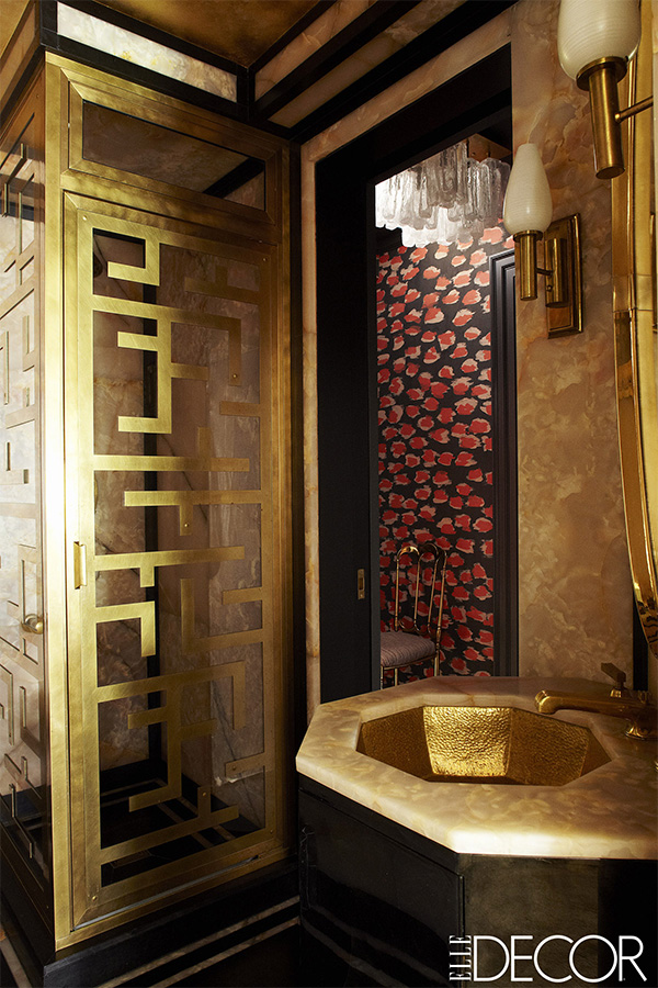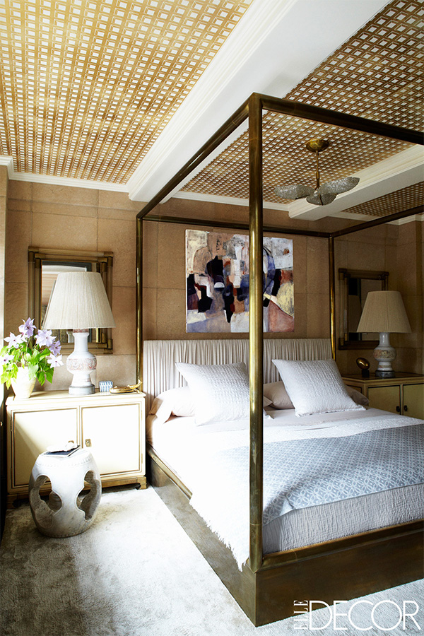 Of all the rooms featured in Cameron Diaz’ home tour, my favorite spaces are Cameron’s unique master bathroom decorated with antiqued-mirror tiles and this gilded bedroom design (shown below). The ceiling in this bedroom is stunning! All of Kelly Wearstler’s selections for Cameron’s home draw you in and leave you wondering about the origin of each individual item in the design. Definitely a sign of great design!